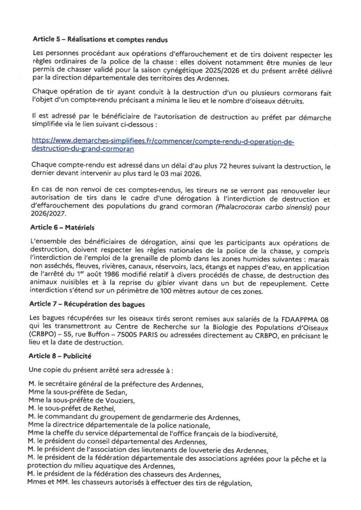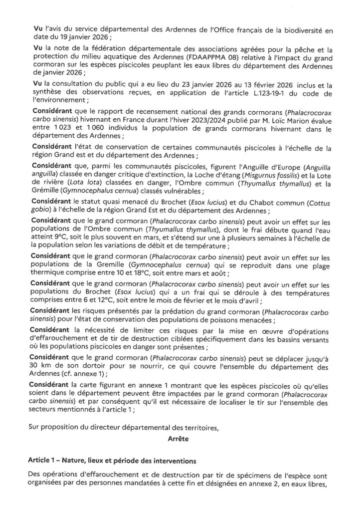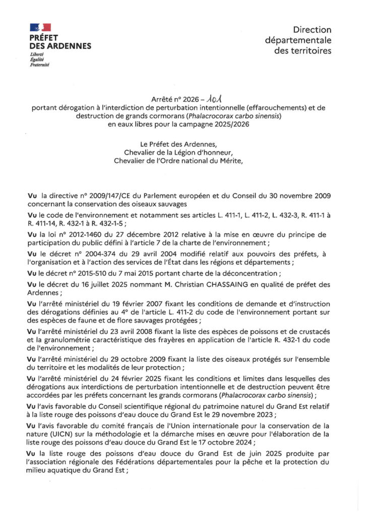Portant dérogation à l’interdiction de perturbation intentionnelle (effarouchements) et de destruction de grands cormorans en eaux libres pour la campagne 2025/2026.