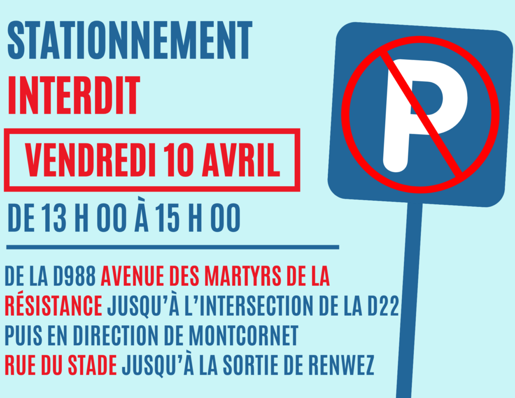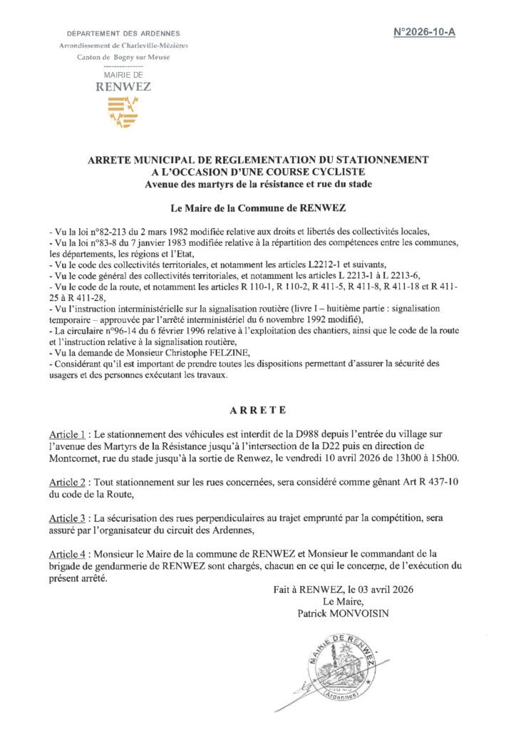 Accueil/Annonce/Arrêté municipal de réglementation de stationnement à l’occasion d’une course cycliste Annonce Arrêté municipal de réglementation de stationnement à l’occasion d’une course cycliste Ville de Renwezil y a 2 heures 187 Moins d’une minute Vendredi 10 avril 2026 de 13 h 00 à 15 h 00. Tagsarrêté interdiction Stationnement Ville de Renwezil y a 2 heures 187 Moins d’une minute Facebook X Linkedin Tumblr Pinterest Reddit VKontakte Partager par email Imprimer